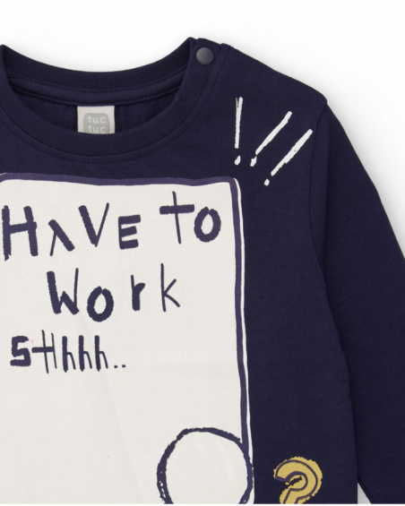 Long-sleeve t-shirt for boys in navy blue, decorated on the front with a striking print that includes comic-style illustrations and messages, with details in white, red and yellow. Made of soft cotton fabric, it provides comfort and freedom of movement, along with a practical shoulder button for easy dressing. Perfect to add an original and playful touch to everyday outfits.