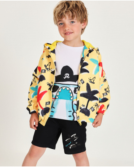 Yellow jacket for boys, made from a lightweight and practical fabric ideal for mid-season days. It features an integrated hood and a front zip fastening, making it easy to put on while providing comfortable protection against the wind. The design stands out with its vibrant palm-tree print in contrasting tones, adding a dynamic and summery touch. Elasticated cuffs and hem ensure a comfortable fit that moves with the child. A functional and eye-catching piece to complete everyday outfits.