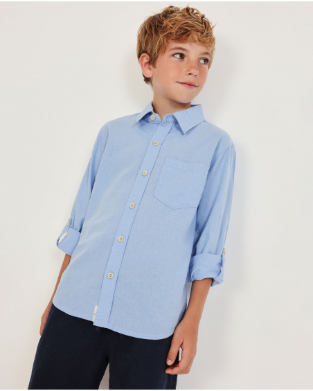 Shirt for boys in light blue, made from a soft and lightweight fabric that ensures comfort throughout the day. It features a classic design with a shirt collar, chest pocket and natural-tone button fastening for a clean and versatile look. The long sleeves include inner tabs that allow them to be rolled up and secured, adding functionality while maintaining an elegant touch. A practical piece that pairs easily to create polished outfits with minimal effort.