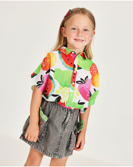 Falda de niña en gris lavado, confeccionada en un tejido denim suave que aporta comodidad y resistencia. Presenta una cinturilla elástica que facilita el ajuste y el movimiento, junto a un botón frontal a contraste que añade un toque llamativo. Incorpora dos bolsillos frontales de gran capacidad decorados con bordados en colores vivos, además de divertidos detalles verdes que simulan hojas asomando, aportando un estilo original y desenfadado. Una prenda cómoda y funcional, ideal para combinar con camisetas y sudaderas en looks diarios llenos de personalidad.