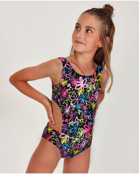 Maillot de bain pour fille en noir, doté d’un style vibrant grâce à son imprimé floral multicolore, apportant une allure estivale et joyeuse. Il présente des découpes latérales, qui offrent un effet moderne et original tout en conservant un excellent confort. Son tissu souple s’adapte en douceur au corps, garantissant une grande liberté de mouvement pour les journées de plage ou de piscine.