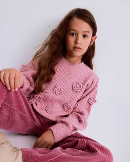 Maglione rosa in maglia per bambina con applicazioni floreali