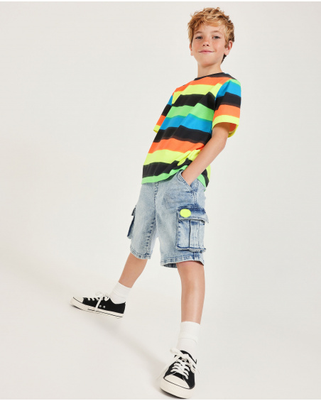 Bermuda da bambino in denim chiaro, realizzata con un tessuto morbido e resistente che garantisce comfort per tutta la giornata. È dotata di vita elastica con coulisse regolabile, che facilita la vestibilità e il movimento. Presenta tasche frontali e tasche cargo laterali con patta, che aggiungono funzionalità al modello. Il lavaggio effetto consumato dona uno stile moderno e disinvolto, ideale per l’uso quotidiano.