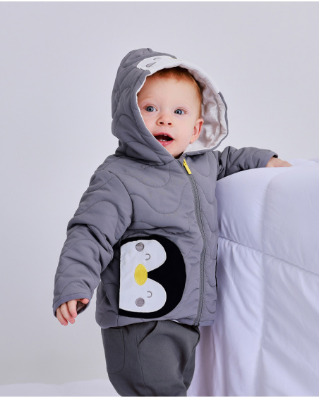 Casaco acolchoado para recém-nascido em cinza com capuz com design de pinguim